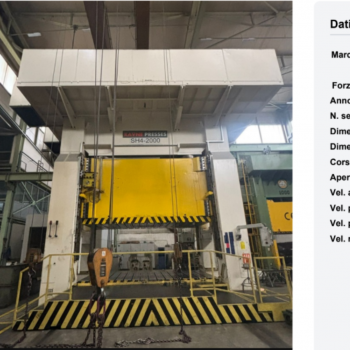 • Pressa idraulica da 2000 ton (20.000 kN), marca RAVNE PRESSES, modello SH4-2000.• Anno 2018, matricola 201700122. Macchina con marcatura CE (come da targhetta).