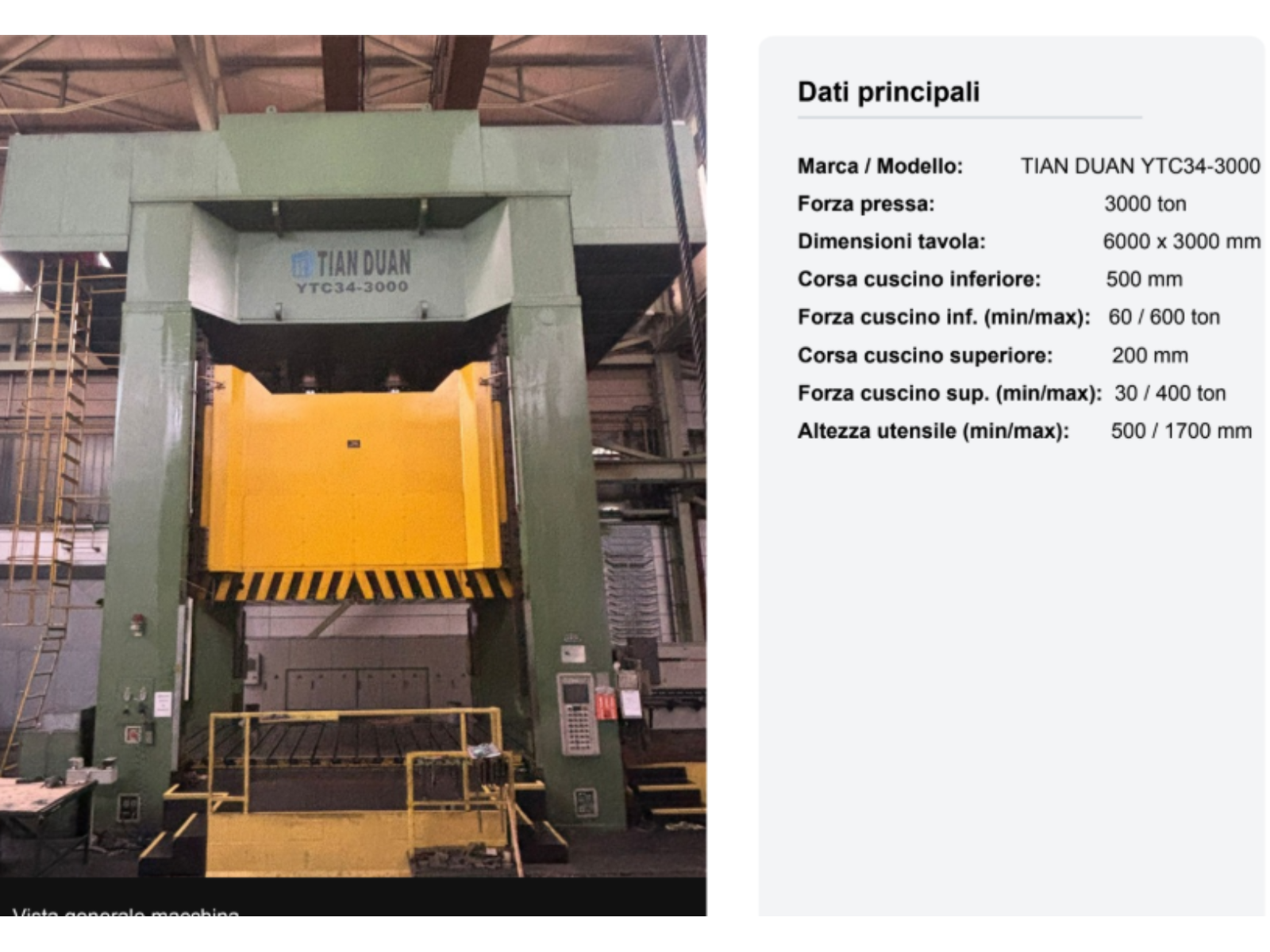 Pressa idraulica da 3000 ton, marca TIAN DUAN, modello YTC34-3000.• Tavola 6000 x 3000 mm (come da targhetta).